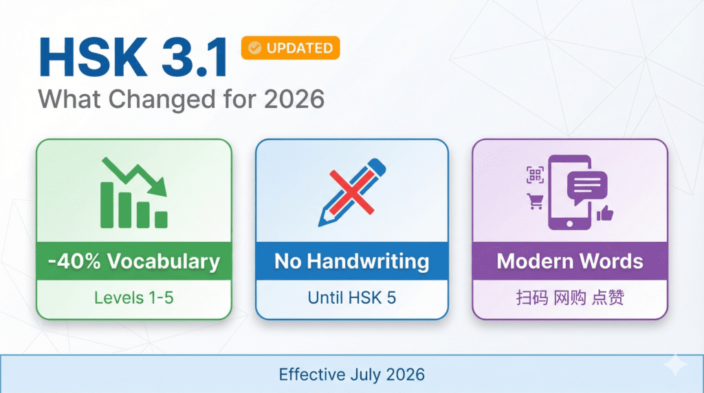 Apparently a new syllabus for the HSK3.0 test has been published and there has been big changes between the HSK 3.0 and what some people are now calling 3.1. For example, level 1 has now only 300 words, not 500.